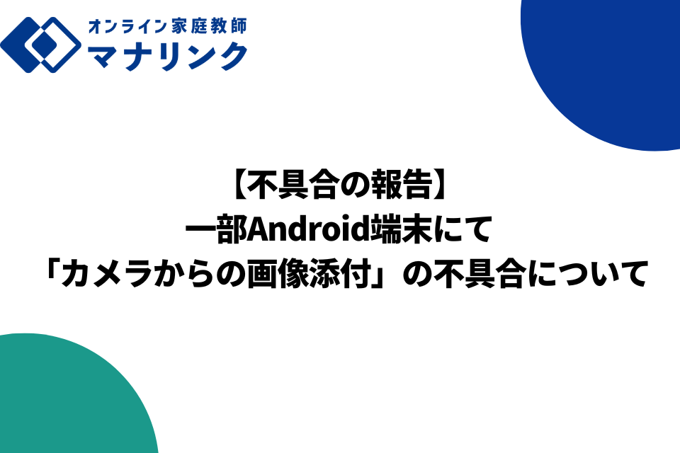 現在、一部のAndroid端末において、マナリンクのアプリから画像を添付する際に「カメラ」機能において一部不具合が発生していることを確認しております。
