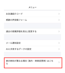 こちらの機能では、授業スケジュールの表示時刻にズレがある場合に、ユーザー様ご自身で現地時刻に合わせて調整いただくことが可能です。