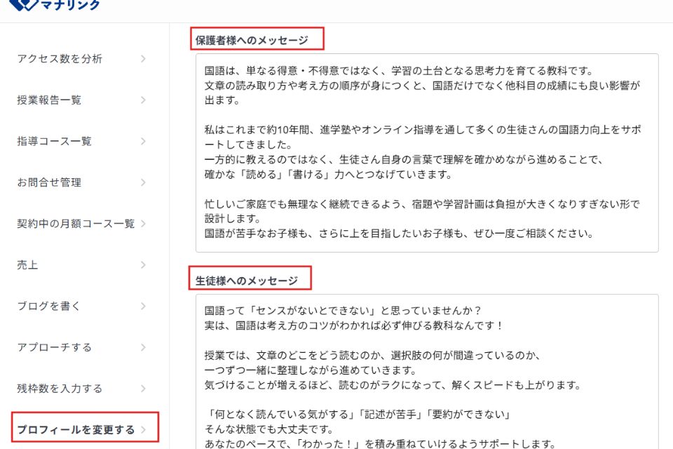 このたび、先生のプロフィールページに「保護者様へのメッセージ」「生徒様へのメッセージ」を掲載できる新しい項目を追加しました。