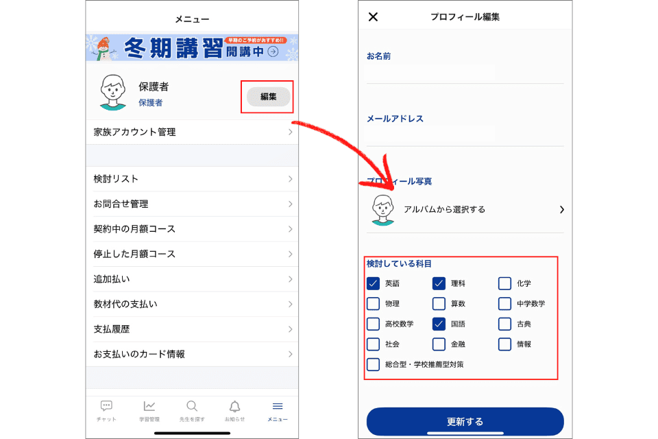 このたび、ご家庭が「苦手科目」「検討中の科目」を自由に編集できる機能をリリースしました!