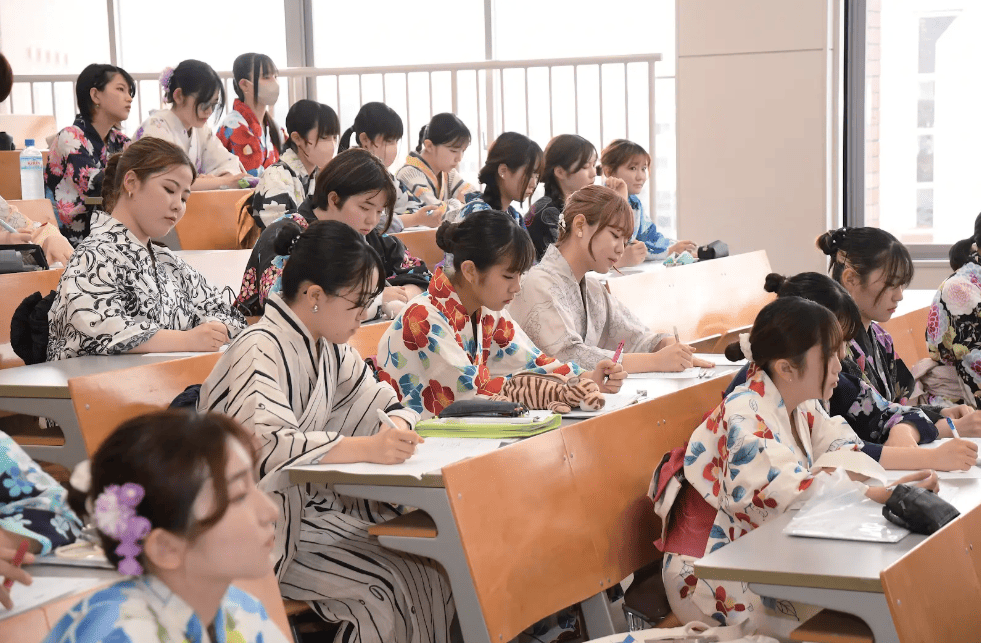 30年以上の歴史を持つ、本学ならではの風物詩です。家庭科の授業で自作した浴衣を「七夕に着てみたい」という学生の願いから始まり、現在では学生の約6〜7割が浴衣や甚平で登校します。色とりどりの装いが学内を華やかに彩る、全国的にも珍しい伝統行事です。