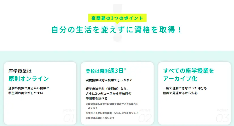 ③夜間部の講義授業は原則オンライン化、週3日通学も可能