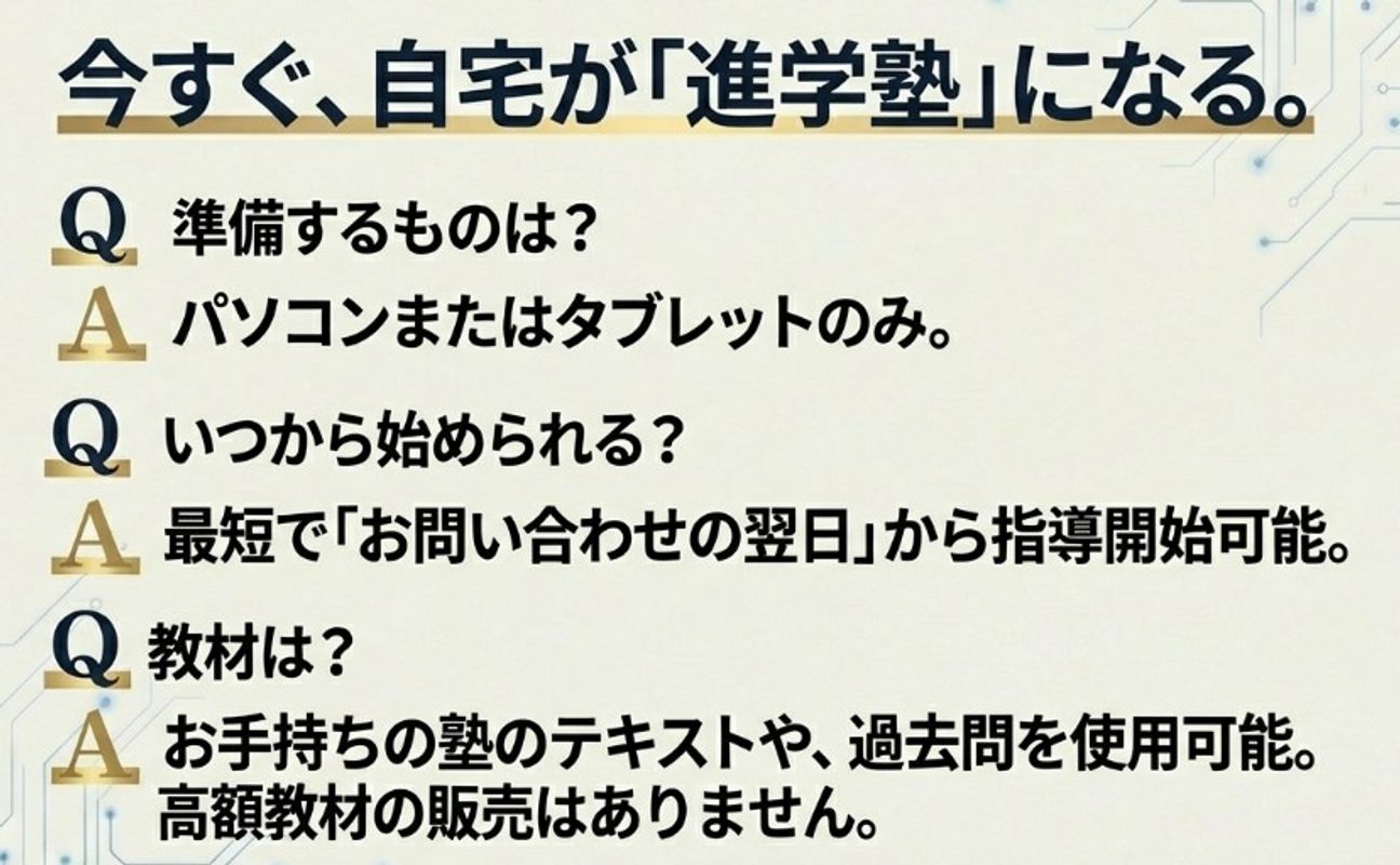 Zoomを使った双方向の授業なので、対面と変わらない効果があります。 むしろ、画面共有で図を大きく見せられるので、対面よりわかりやすいという声も多いです。 授業後に「ポイント画像」をプレゼントするので、復習もしやすいです。