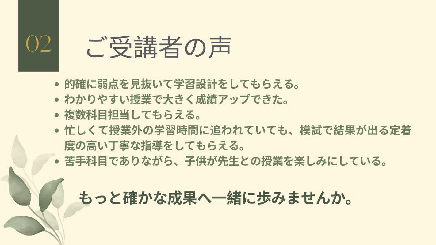 先生の授業のおかげで、定期テストの成績がいきなり上がりました。課題を的確に見つけて、短いサイクルで文法問題を繰り返した成果だと思います。何より子供のモチベーションが上がったことに感謝です!次回に向けて、本人もより上の目標を設定して受身から自主的に取り組もうとしてる姿勢に変化出来たのも先生の指導のおかげだと思います。引き続き、宜しくお願いします。