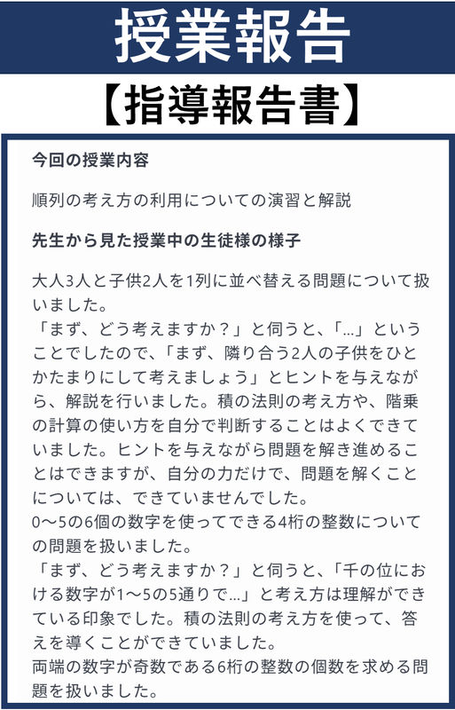 毎回の授業後に、当日の授業内容、生徒さんの勉強の様子、学習内容の理解度などを指導報告書にしてお送りさせていただきます。