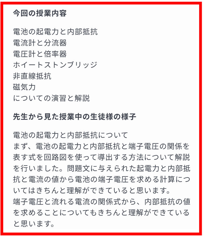 毎回の授業後に、当日の授業内容、生徒さんの勉強の様子、学習内容の理解度などを記載した指導報告をお送りいたします。