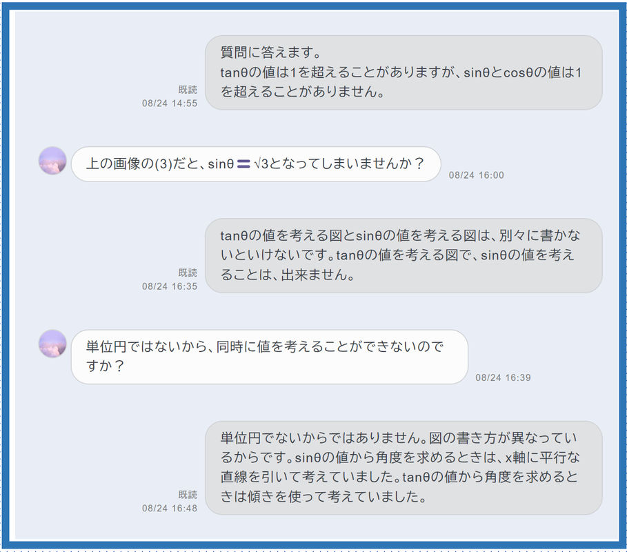 日曜日のオンライン授業で習った箇所が、早速、月曜日の学校の補習で出たらしく、5問中5問解答できたとの事。その際、学校の先生に「全問出来た人は手を挙げて」と言われて、手を挙げたらしいです。嬉しそうに話してくれました。ありがとうございます。(高校1年生・女性)
