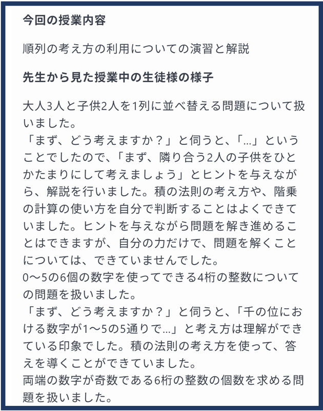 毎回の授業後に、当日の授業内容、生徒さんの勉強の様子、学習内容の理解度などを指導報告書にしてお送りさせていただきます。
