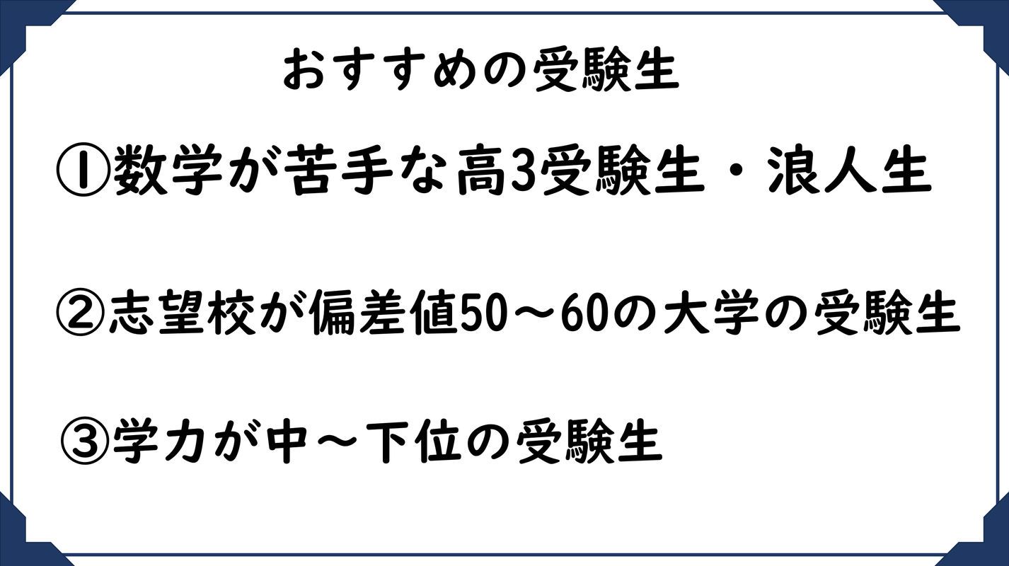 本指導コースは、数学が苦手な高3受験生・浪人生、志望校が偏差値50~60の大学の受験生、学力が中~下位の受験生におすすめのコースとなっております。