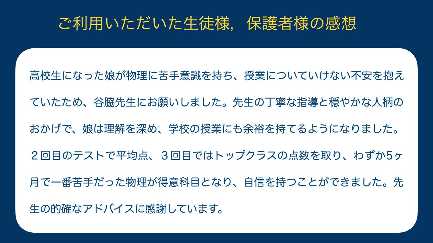 物理の定期テストの点数がなかなか取れず、学校の授業と自学のみでは限界を感じ、先生を探していました。まずは平均点を取るという的確な目標を定めて下さり、どこが点を取れない原因なのかを直ぐに見抜いて親身になって丁寧に指導をしてくださいました。すると受けたテストで手応えを感じ、初めて『解けた』という感覚が持て、しっかりと目標を達成することができました。いつも自信が持てず、勉強の仕方も分からず困っていた科目に希望が持てました。谷脇先生のご指導のおかげだと、感謝しています。更に次の定期テストも、また目標を持って頑張っていこうと思います。先生ありがとうございます!