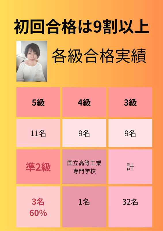 小学5年生7月5級の学習から受講スタート、10月5級合格。同年11月から4級の学習スタート、翌年6年生6月4級合格。現在3級合格に向け準備中。