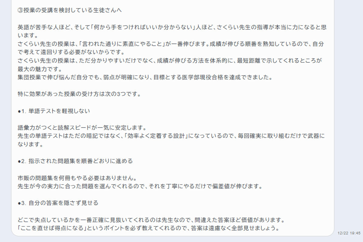 ★このコースを受講していた生徒が合格体験記を書いてくれましたので,申し込みを検討されている場合は参考になさってください。