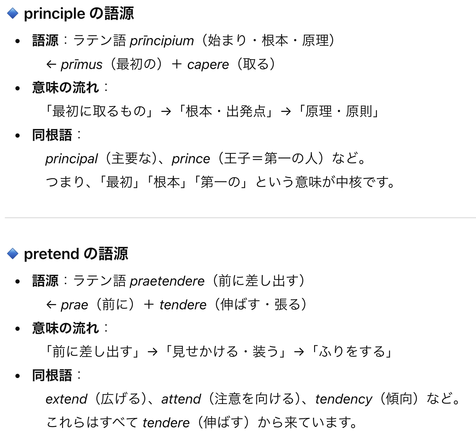 カタカナで発音を当てつけると、「プリテンド」と「プリンシプル」。