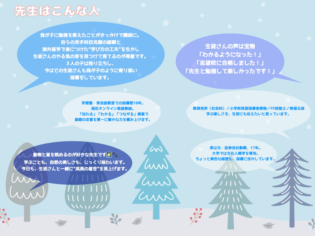 生徒さんお一人お一人にあった授業を組み立てますのでご安心ください。まずは小学生として身につけておきたい学習内容の習得を第一に目指します。また、オンラインで1対1の学習をしますので周囲を気にすることなく勉強できます。勉強が楽しいと感じていただければ嬉しいです。生徒様に最適な学習の場をご提供できればと思います。