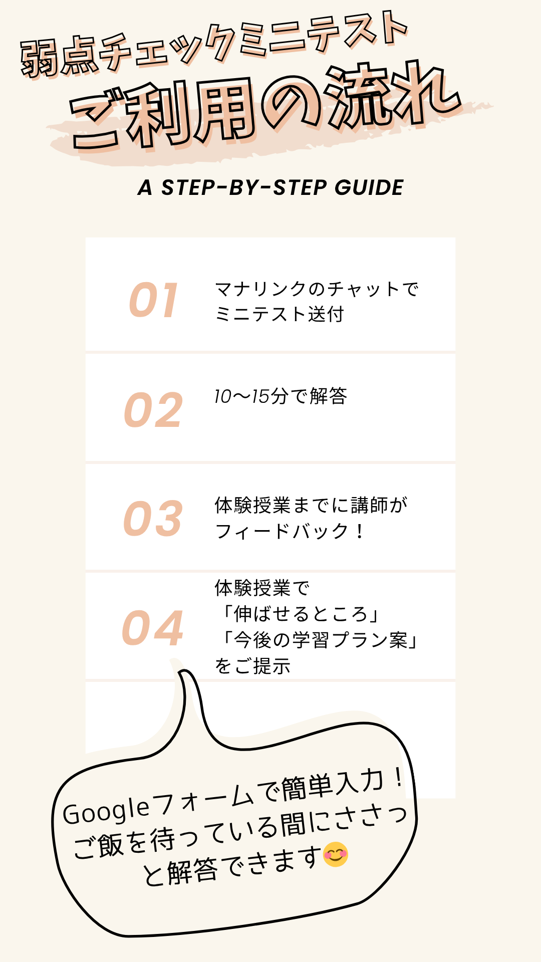 お問い合わせ頂いた段階で【弱点チェックミニテスト】へのGoogleフォームへご案内いたします。
